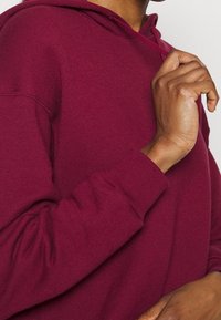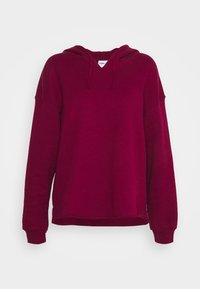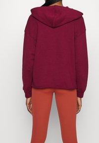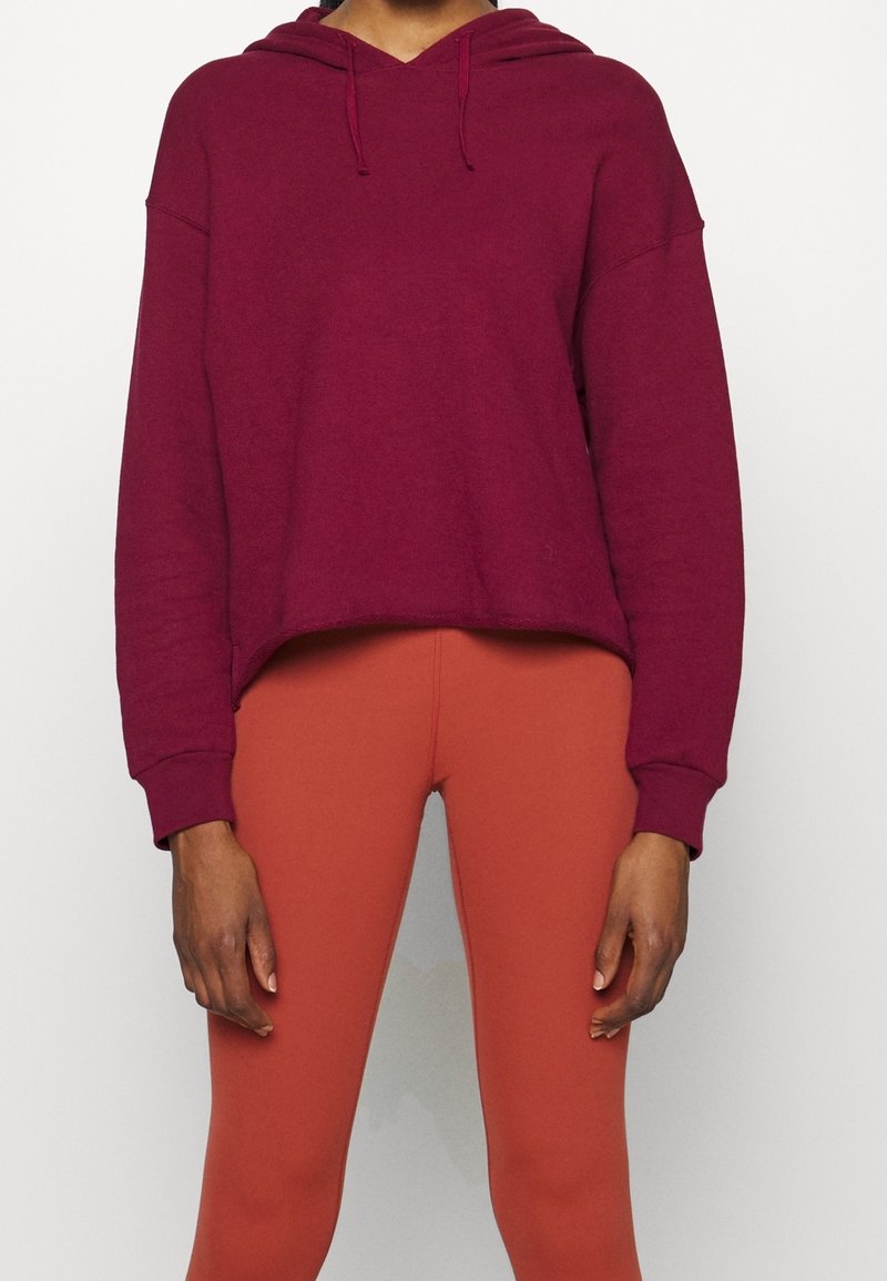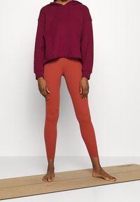 Personne portant un sweat à capuche bordeaux et un legging orange brûlé, debout devant un fond clair uni avec les bras détendus le long du corps.