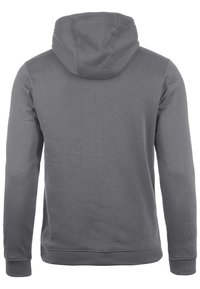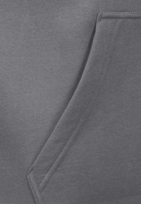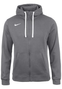 Sweat à capuche gris zippé à l'avant, avec une fermeture éclair, des cordons blancs, et un petit logo blanc sur la poitrine gauche. Comprend deux poches avant et une texture douce.