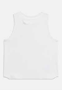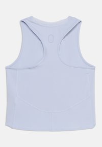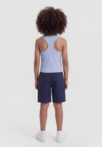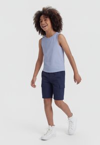 Enfant souriant aux cheveux bouclés marchant, portant un débardeur bleu clair, un short cargo bleu marine et des baskets montantes blanches.