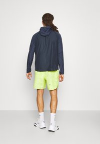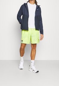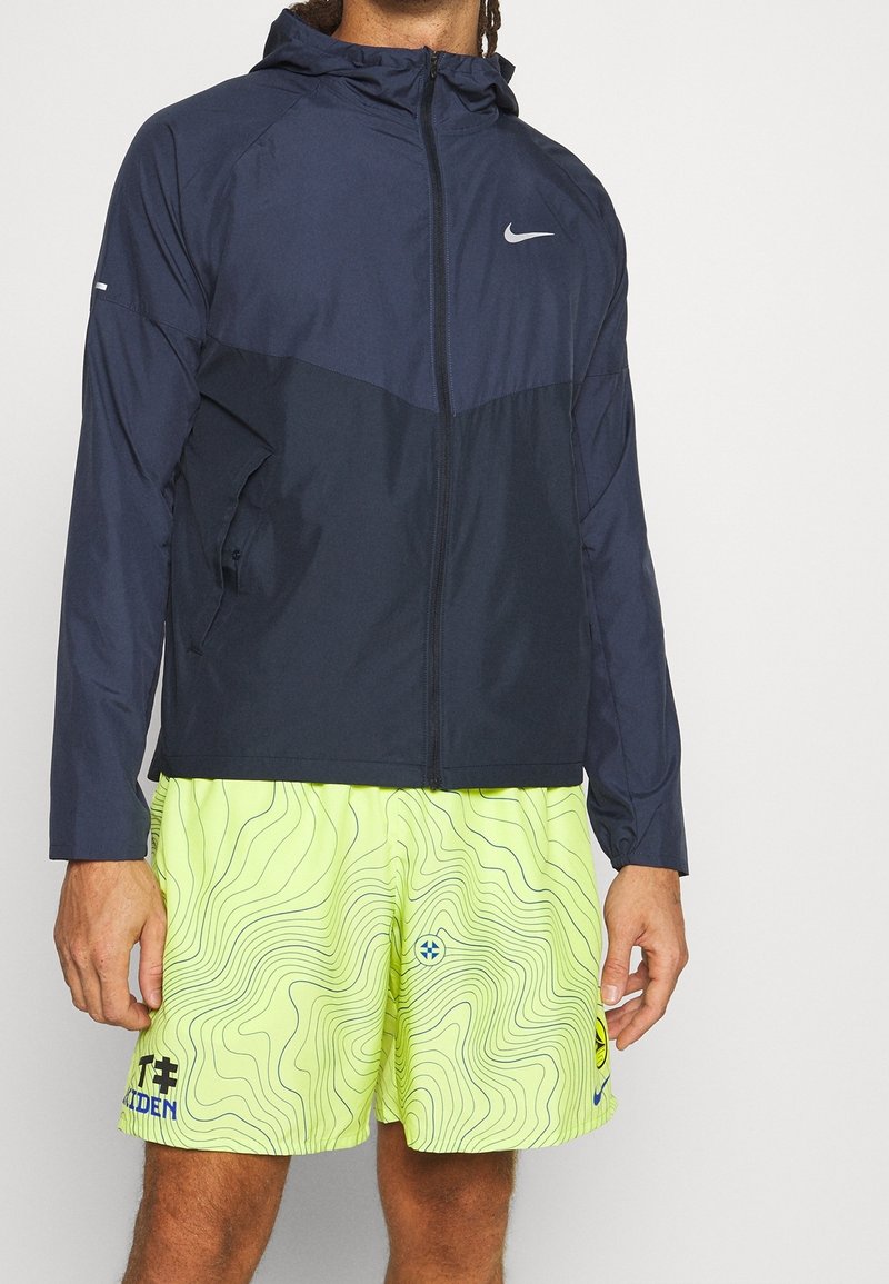 Homme portant une veste à capuche zippée Nike bleu marine et un short de sport jaune néon avec des lignes topographiques noires et des logos, debout devant un fond blanc.