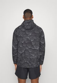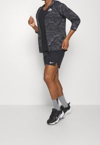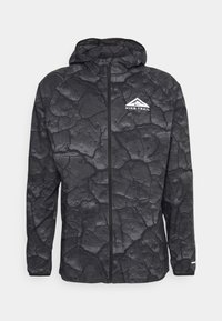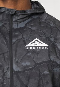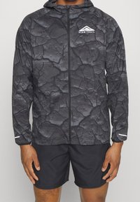 Homme portant une veste à capuche zippée Nike Trail noire avec motif craquelé et un short noir, debout les mains détendues le long du corps.