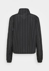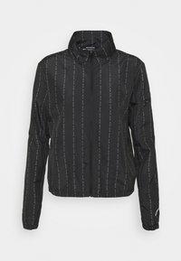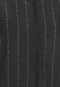 Veste noire à manches longues avec fermeture éclair, rayures verticales "NIKE", col montant, poignets élastiques et poche zippée sur la manche gauche.