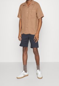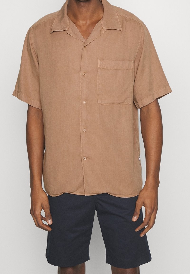 Homme portant une chemise à manches courtes marron avec une poche poitrine et un short noir jusqu'aux genoux, sur un fond uni.
