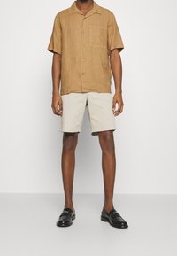 Homme portant une chemise à manches courtes marron clair avec poche poitrine et un short beige clair sur un fond uni.