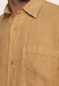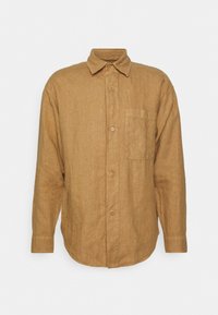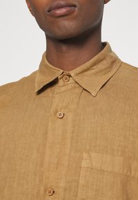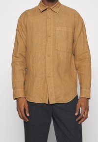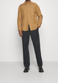 Homme portant une chemise boutonnée à manches longues couleur beige avec une poche avant et un pantalon noir, debout devant un fond blanc uni.