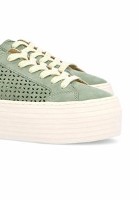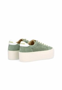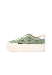 Baskets compensées en daim vert avec un design perforé, semelle en caoutchouc blanche et lacets crème. Présente une petite étiquette de marque à l'arrière.