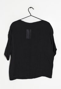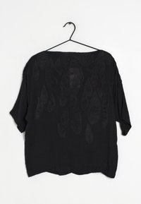 Chemise noire ample avec un large décolleté, des manches courtes et des motifs texturés ressemblant à des gouttes. Suspendue à un crochet noir.