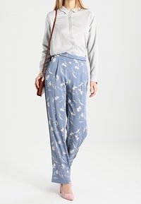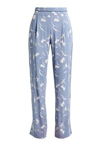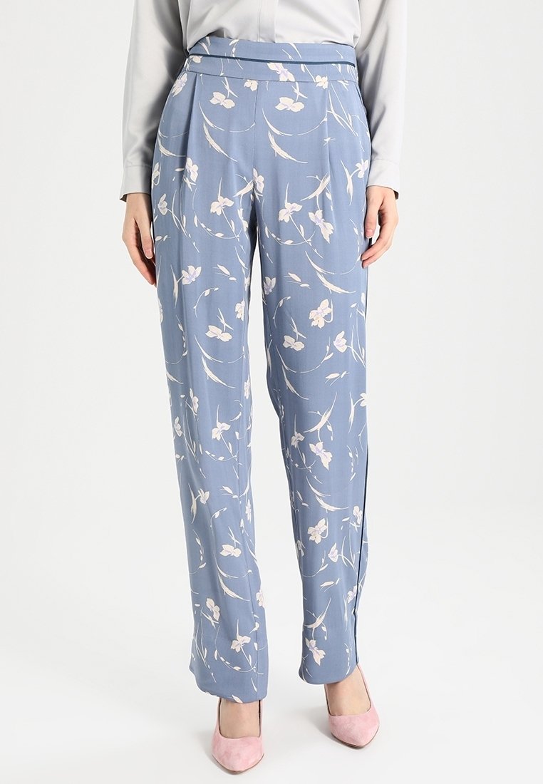 Pantalon bleu clair à imprimé floral avec une taille haute, présentant des motifs de fleurs roses et blanches, un tissu fluide et une coupe ample.