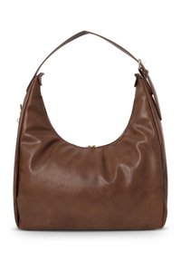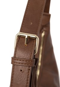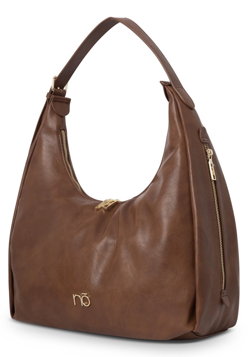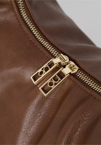 Sac à bandoulière en cuir marron avec des fermetures éclair dorées, une seule bandoulière et un petit logo doré à l'avant.