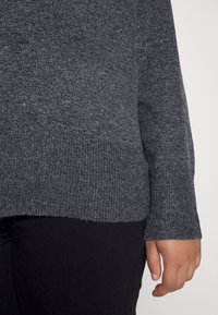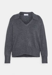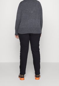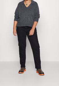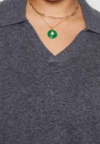 Personne portant un pull à col en V à manches longues gris foncé, un pantalon noir et deux colliers, dont un avec un pendentif vert.