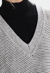 Pull gris clair à mailles ouvertes avec col en V, épaules tombantes et manches longues. Texture douce ; porté sur un col roulé noir.