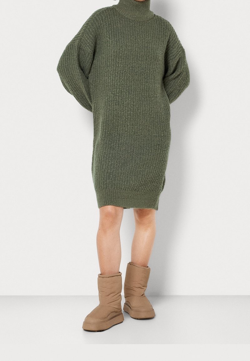 Robe tricotée verte avec col roulé et manches surdimensionnées, associée à des bottes couleur camel montant jusqu'à mi-mollet, présentant un design texturé et rembourré.