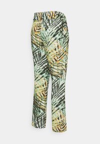Pantalon ample avec imprimé de feuilles tropicales vertes, marron et noires, taille à cordon et jambes droites sur fond blanc.
