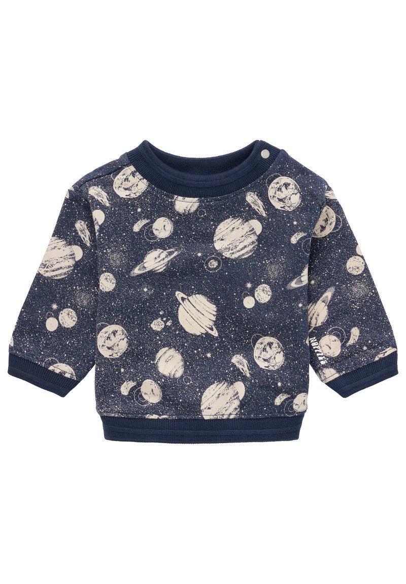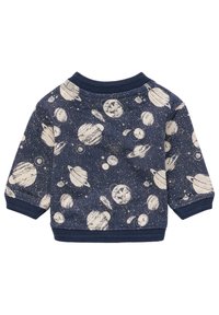 Pull pour tout-petit bleu marine avec imprimé à thème spatial blanc comprenant des planètes, des lunes, des étoiles, et un petit bouton près de l'encolure.