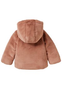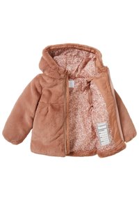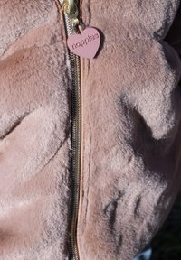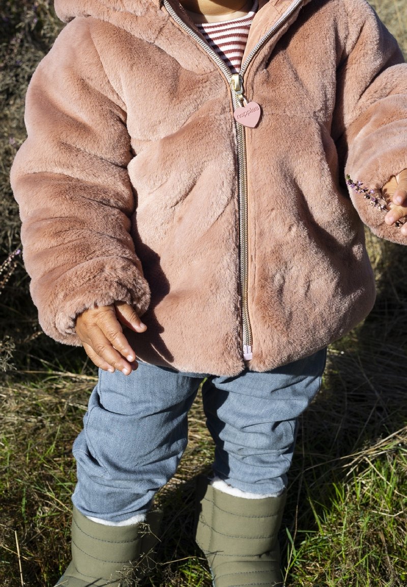 Veste d'hiver en duvet rose flou avec une fermeture éclair à l'avant, un col côtelé et une tirette en forme de cœur. Associée à un jean bleu et des bottes vert olive.