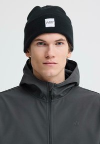 Jeune homme portant un bonnet noir et une veste à capuche grise zippée, regardant sur le côté contre un fond uni.