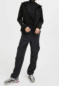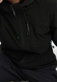 Personne portant une veste imperméable noire avec une capuche, des fermetures éclair à l'avant et sur la poitrine, et des poignets ajustables, associée à un pantalon foncé.