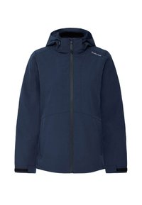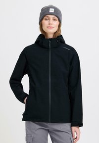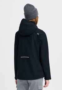 Personne portant une veste à capuche noire avec un petit logo sur l'épaule et un bonnet gris, vue de dos sur fond blanc.