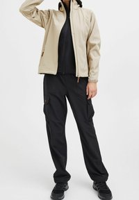 Veste beige à fermeture éclair avec col montant et poches zippées portée sur un pantalon noir, modèle tenant le bras gauche derrière le dos.