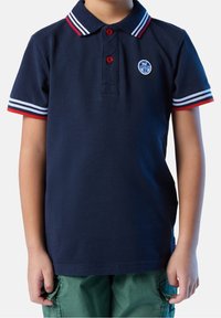 Enfant portant un polo bleu marine avec un col et des manches à rayures rouges et blanches, associé à un short cargo vert.
