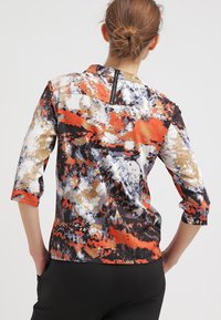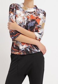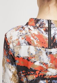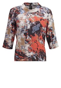 Haut multicolore présentant des motifs abstraits en rouge, bleu, noir et or. Confectionné dans un tissu lisse avec un col rond et des manches trois-quarts.