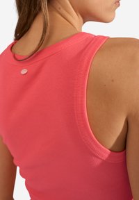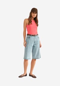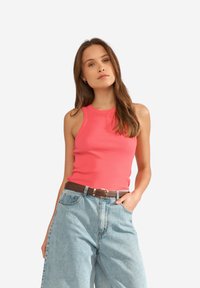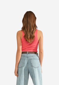 Jeune femme aux longs cheveux bruns portant un haut corail sans manches, un jean taille haute bleu clair et une ceinture marron foncé, debout avec une main dans la poche.