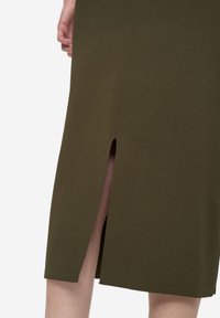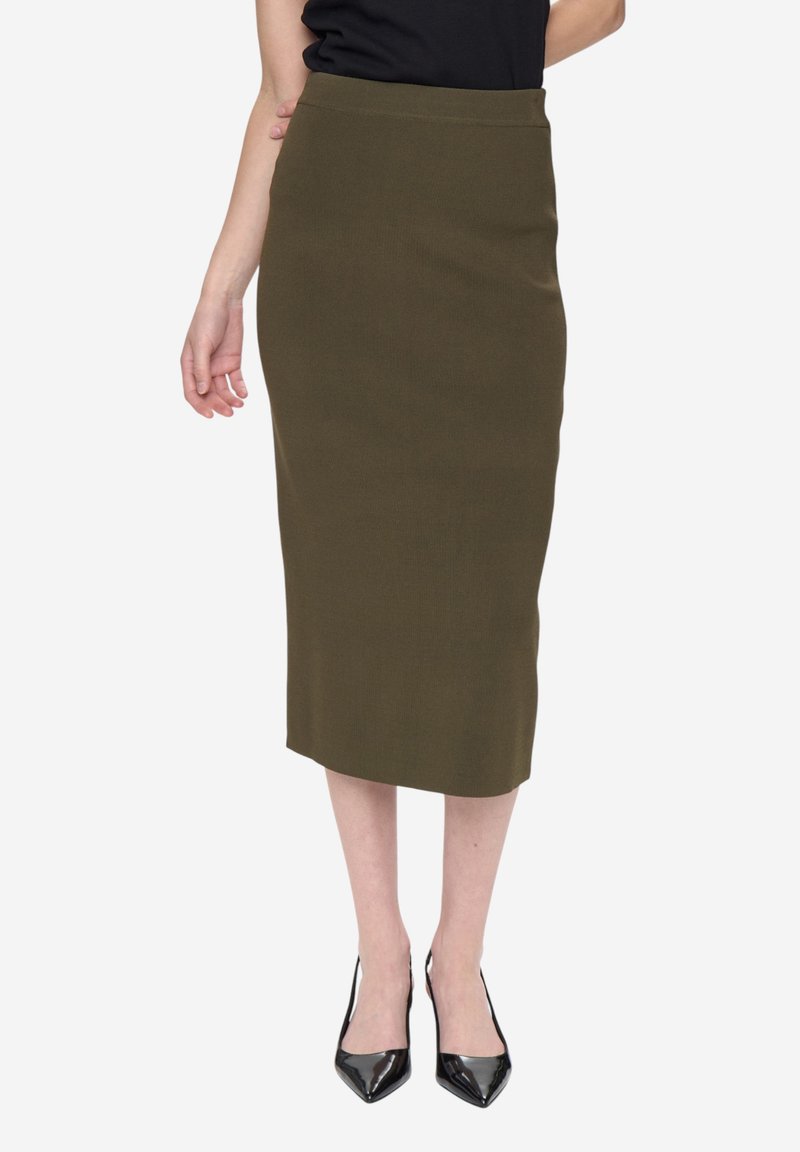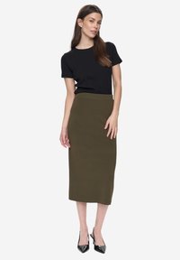 Jupe crayon vert olive en tissu côtelé, longueur genou, coupe droite avec une taille haute, associée à des escarpins noirs à bout pointu.