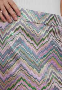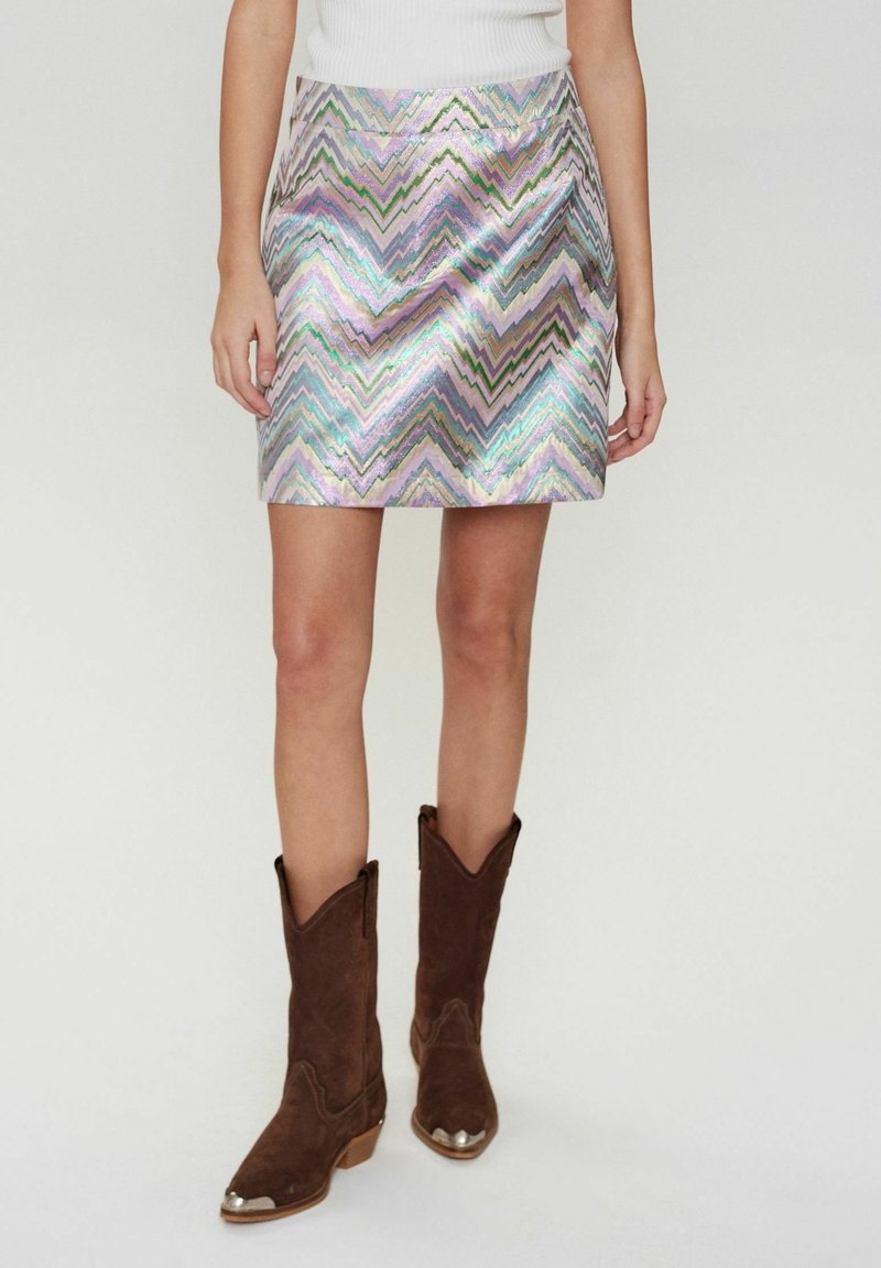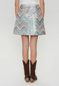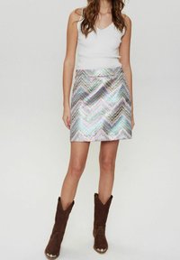 Mini-jupe iridescente argentée avec un motif en zigzag dans des tons de rose, vert et bleu ; associée à des bottes de cowboy marron à bouts pointus.