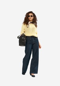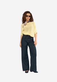 Femme aux cheveux bouclés portant un pull en maille jaune clair et un jean bleu foncé, debout dans une posture détendue sur un fond uni.