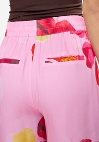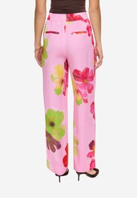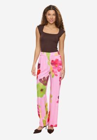 Femme portant un pantalon taille haute à jambes larges rose avec de grandes impressions florales colorées, associé à des talons marron à bouts pointus.