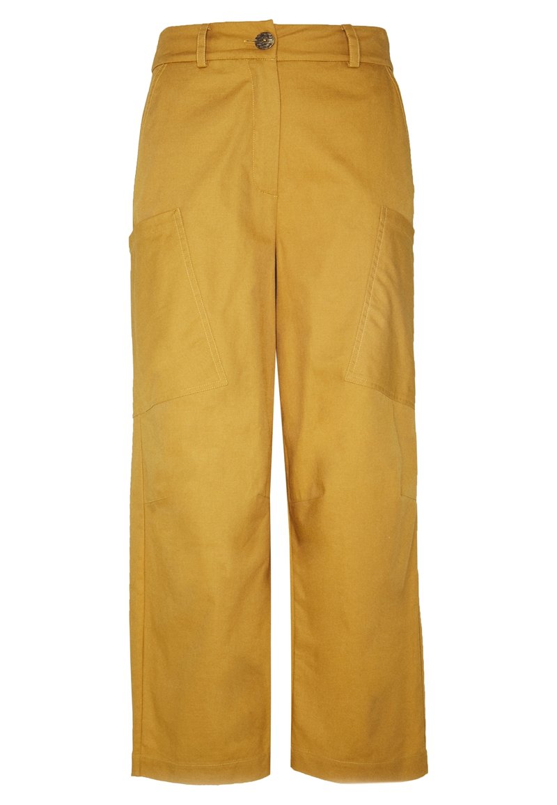 Pantalon cargo à jambes larges en coton jaune moutarde, avec deux grandes poches avant, une fermeture à boutons et des détails de coutures visibles.