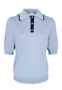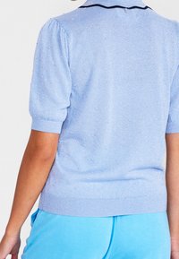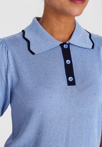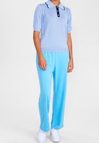 Femme portant un haut tricoté à manches courtes bleu clair avec un col festonné et une patte de boutonnage noire, associé à un pantalon bleu vif.