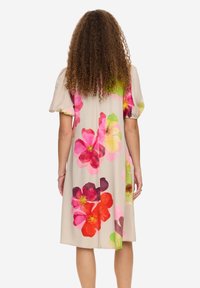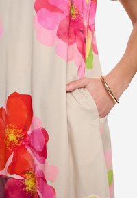 Femme aux cheveux bouclés portant une robe beige mi-longue avec de grands imprimés floraux roses, rouges et verts, souriante, les mains détendues le long du corps.