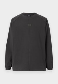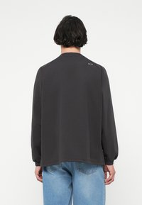 Sweatshirt long gris foncé à manches longues avec col rond et manches raglan ; tissu doux, branding minimal sur la poitrine, coupe décontractée.