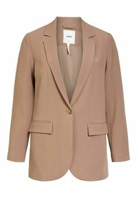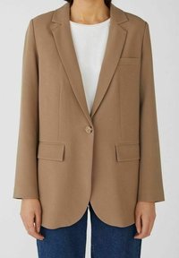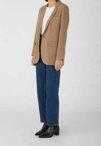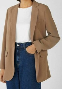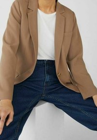 Femme portant un blazer camel à simple bouton sur une chemise blanche et un jean bleu, debout avec les bras détendus le long du corps.