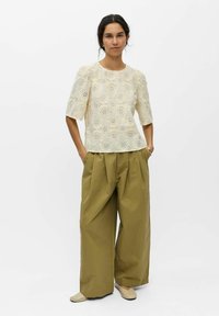 Femme aux cheveux foncés en chignon bas portant un chemisier en dentelle crème à manches bouffantes et un pantalon ample vert olive, les mains dans les poches.