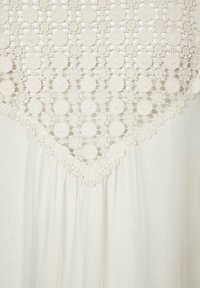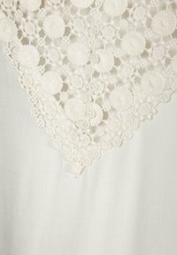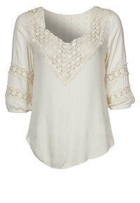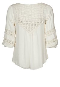Blouse crème avec décolleté en V en dentelle et bandes en dentelle sur les manches bouffantes mi-longues, avec un ourlet arrondi.