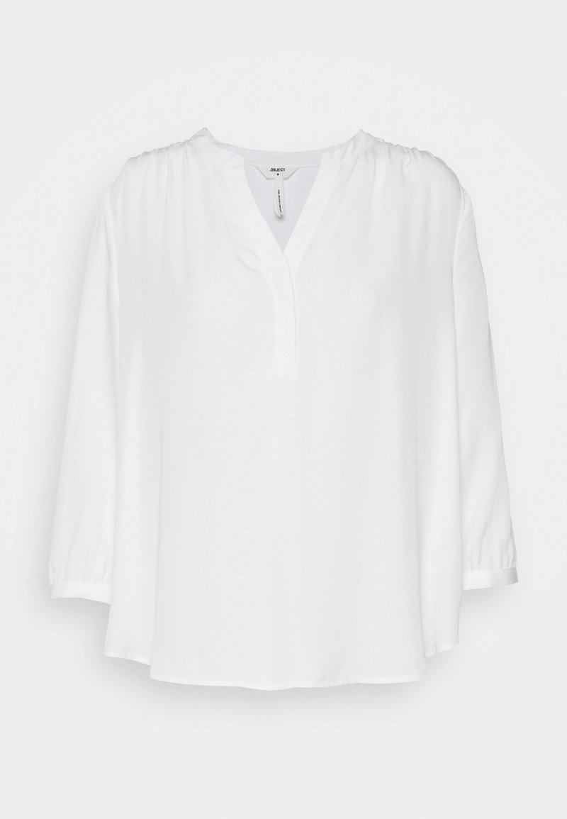 Blouse blanche ample avec manches 3/4, petit col montant et patte de boutonnage devant, en tissu léger.