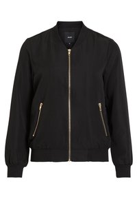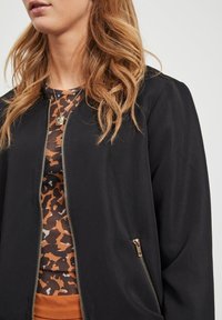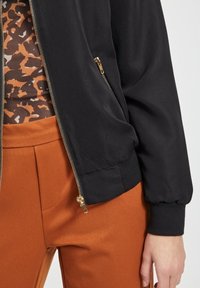 Blouson aviateur noir avec fermeture éclair à l'avant, poignets côtelés et poches latérales. Texture douce et coupe ajustée, associé à un pantalon couleur rouille.