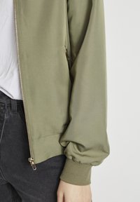 Personne portant une veste bomber vert olive sur une chemise blanche et un jean noir, avec une main touchant le menton et l'autre bras croisé.