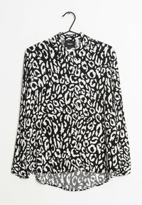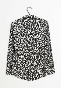 Chemise à manches longues boutonnée avec imprimé léopard noir et blanc, suspendue sur un cintre noir sur fond blanc.