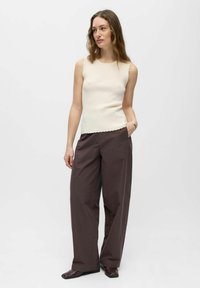 Jeune femme aux cheveux bruns ondulés, portant un top côtelé crème sans manches et un pantalon taille haute marron foncé sur fond blanc.