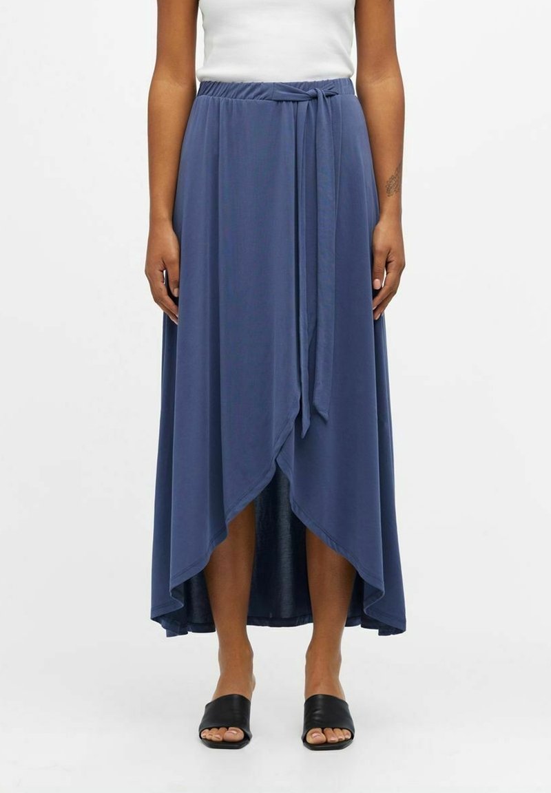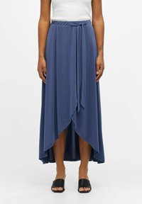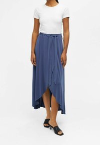 Jupe longue portefeuille bleue avec un ourlet asymétrique, en tissu léger, dotée d'un détail à la taille avec un lien et d'une texture lisse. Portée avec des sandales noires.