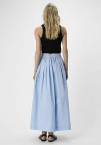 Jupe longue plissée bleu clair en tissu léger, dotée d'une large ceinture et de poches latérales. Portée avec des chaussures noires sans lacets.