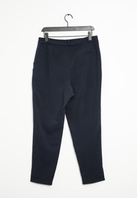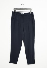 Pantalon bleu marine foncé ajusté avec plis sur le devant et poches latérales, suspendu à un cintre en plastique noir sur un fond blanc.