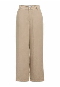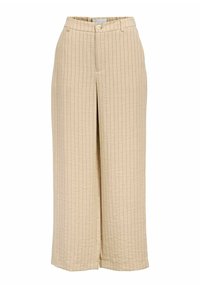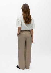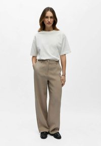 Personne portant un pantalon beige ample et texturé, une chemise blanche à manches courtes, des mocassins noirs, debout les mains détendues le long du corps.