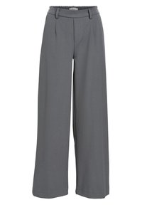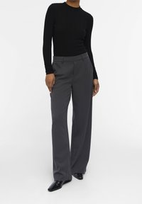 Mannequin portant un pantalon gris foncé taille haute à jambes larges avec poches latérales, associé à un haut noir à manches longues et des chaussures pointues noires.