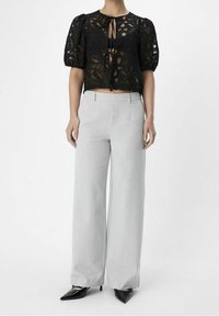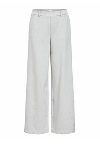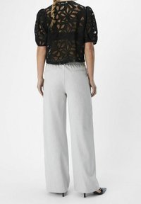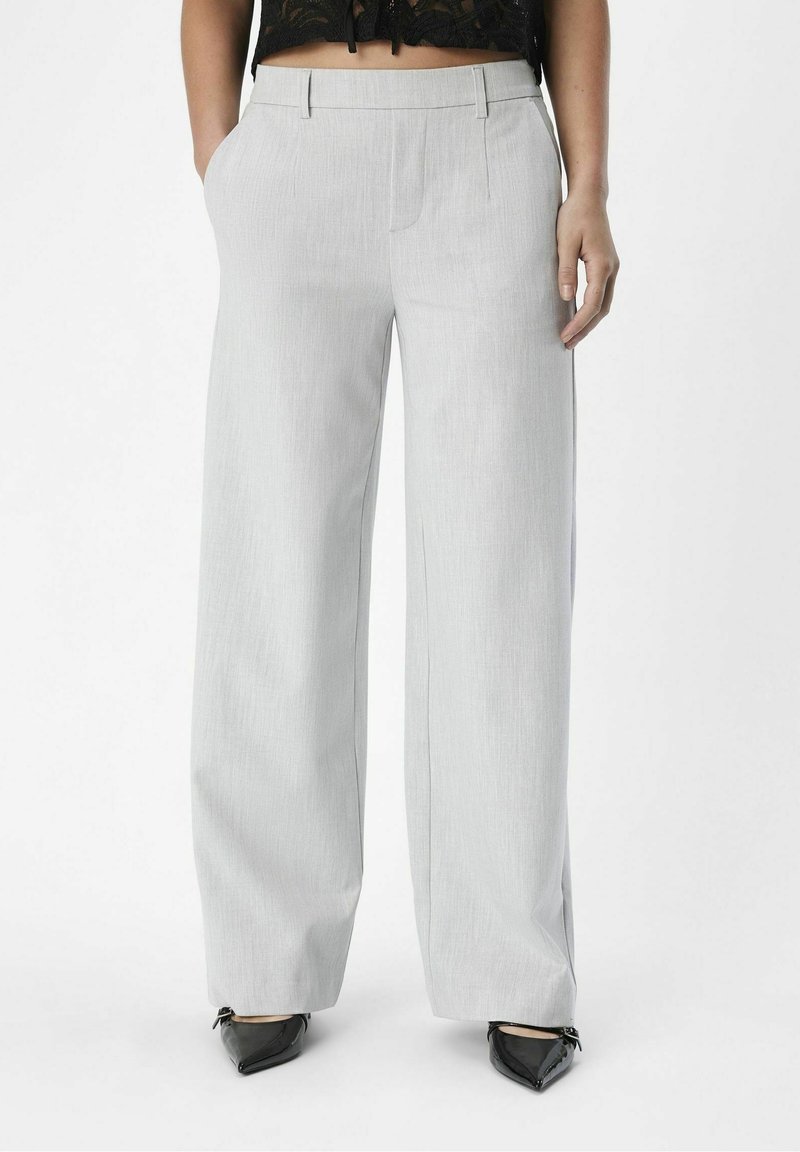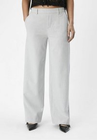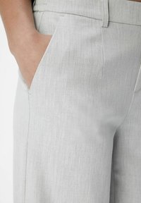 Pantalon large gris clair en tissu texturé, doté de poches avant et d'une coupe ajustée. Associé à des chaussures noires à bout pointu.