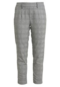 Pantalon à carreaux gris avec une coupe ajustée, taille haute et jambes droites, associé à des bottines noires.