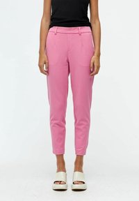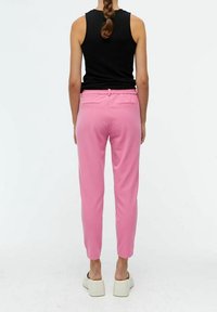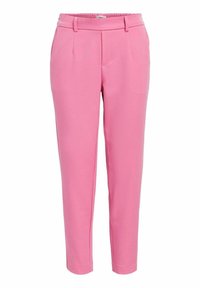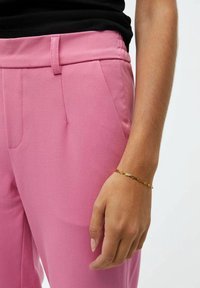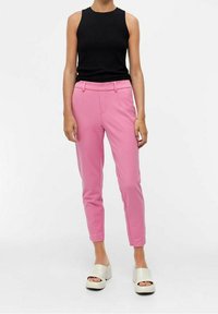 Pantalon rose fuselé en tissu lisse, avec un devant plat, des poches latérales et une taille mi-haute. Porté avec des sandales blanches épaisses.